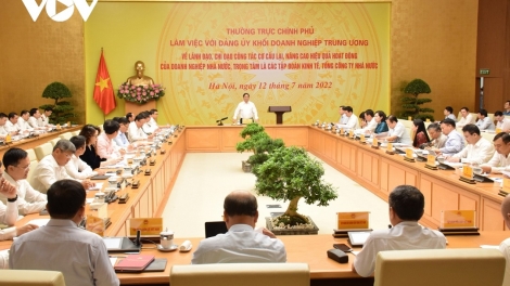 (VOVWORLD) - 12日上午,越共中央政治局委员、政府总理范明政在政府总部主持召开政府常务委员会与中央企业党委座谈会,就以国有经济集团和总公司为核心的国企重组和提高经营效率的领导和指导工作进行讨论。