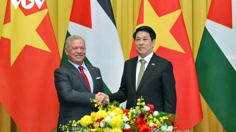 (VOVWORLD) - 约旦国王阿卜杜拉二世·本·侯赛因(Abdullah II Ibn Al Hussein)一行11月13日下午离开河内,圆满结束应越南国家主席梁强的邀请于11月12日至13日对越南进行的正式访问。