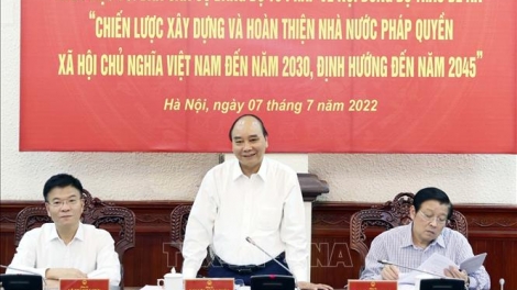 (VOVWORLD) - 按照 “2030年建设和完善越南社会主义法治国家战略及2045年方向”提案起草工作指导委员会与各部门、各机关就提案内容举行工作会议的计划,越南国家主席、提案起草工作指导委员会主任阮春福7月7日主持召开委员会常委与公安部党委及司法部党组干事会的工作会议。