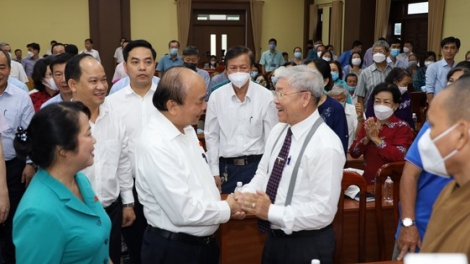 (VOVWORLD) -6月21日上午在胡志明市,越南国家主席阮春福和胡志明市第二号国会代表组与胡志明市第一郡选民接触,回报第十五届国会第三次会议结果。