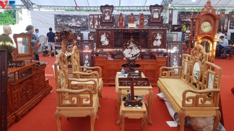 (VOVWORLD) -参展产品按区域和门类分组,如:镶珍珠木器和漆器组;鞋类、提包和钱包组;纺织品服装组;机械组;加工食品、饮食、蔬菜水果、禽蛋组等。