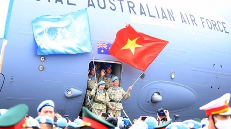 (VOVWORLD) - 在抵达联阿安全部队驻地前,一号工兵队经历了陆路和空中行军。由于每种车辆的运输能力不同,人员编队也不断变化。