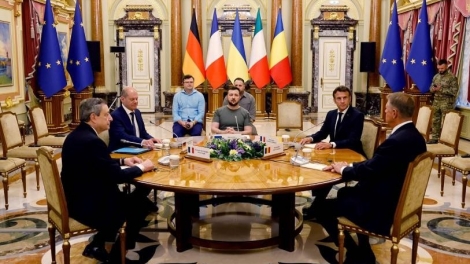 (VOVWORLD) - 法国总统马克龙6月16日表示,正出席在首都基辅举行的法国、德国、意大利、罗马尼亚和乌克兰五方会谈的四个欧盟国家领导人都支持“立即”给予乌克兰欧盟候选国地位的想法。