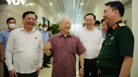 (VOVWORLD) - 越南第十五届国会第三次会议前夕,越共中央总书记阮富仲与河内国会代表团5月12日在河内市栋多、巴亭、二征夫人三郡开展选民接触活动。