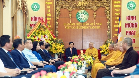 (VOVWORLD) -适值佛历2566年佛诞节,11日上午,越南政府常务副总理范平明在河内探望越南佛教协会中央委员会领导人、僧尼和佛教信徒并向他们致以节日祝贺。