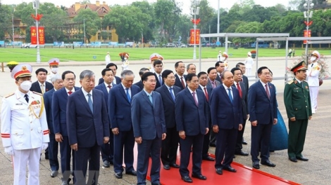 (VOVWORLD) -值越南南方解放、国家统一47周年之际,越南国家主席阮春福、政府总理范明政、国会主席王庭惠率领的越共中央、国家主席、国会、政府、祖国阵线、中央各部门、团体组织代表团4月27日上午前往胡志明主席陵敬献花圈,入陵瞻仰胡志明主席遗容,同时在河内市北山街英雄烈士纪念碑举行上香仪式,缅怀历代英雄烈士。