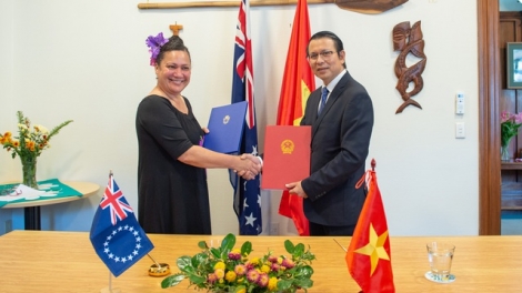 (VOVWORLD) -越南驻新西兰大使阮文忠和库克群岛驻新西兰高专伊丽莎白·赖特-科特卡(Elizabeth Wright-Koteka)4月26日在新西兰首都惠灵顿代表越南政府和库克群岛政府签署越南与库克群岛建立外交关系的联合公报。