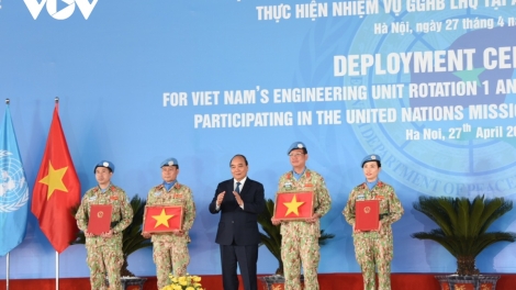 (VOVWORLD) -越南国防部4月27日在河内举行越南一号工兵队和四号二级野战医院赴阿卜耶伊和南苏丹执行联合国维和任务的出征仪式。仪式上,越南国家主席阮春福向一号工兵队和四号二级野战医院颁发执行任务的决定书。