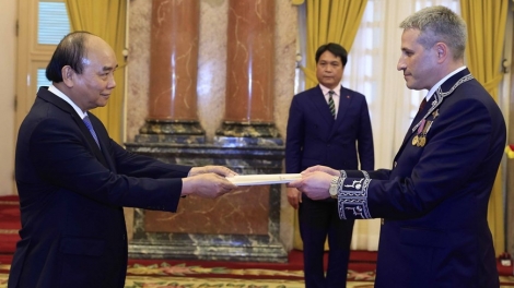 (VOVWORLD) - 越南国家主席阮春福4月13日下午在主席府分别会见前来递交国书的白俄罗斯新任驻越大使巴拉维科夫(Vladimir Baravikov)和埃及新任驻越南大使萨拉马(Amal Abdel Kader Elmorsi Salama)。