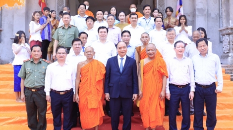 (VOVWORLD) - 在西南部地区各省走访调研期间,越南国家主席阮春福4月7日造访芹苴市乌门郡高棉南宗佛学院,并在这里向高棉族同胞致以传统新年(Chôl Chnăm Thmây)祝福。