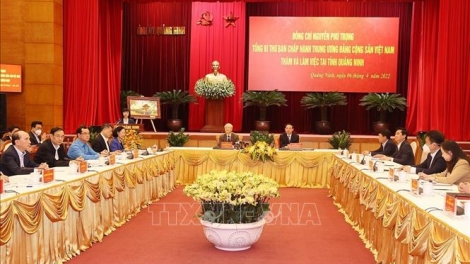 (VOVWORLD) - 在广宁省走访调研期间,越共中央总书记阮富仲4月6日与广宁省省委常委、省人委领导班子就越南共产党第十三次全国代表大会决议及越共广宁省第十五次代表大会决议执行情况举行工作会议。