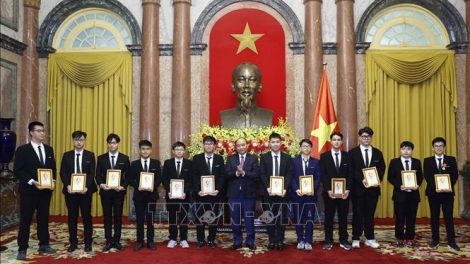 (VOVWORLD) - 12月18日下午,越南国家主席阮春福在主席府向荣获奥林匹克和国际科技奖的学生颁发劳动勋章。