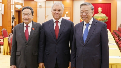 (VOVWORLD) - 越共中央总书记苏林9月29日上午在河内会见了正对越南进行访问并共同主持越南国会与俄罗斯国家杜马合作委员会第四次会议的俄罗斯国家杜马主席维亚切斯拉夫·沃洛金(Vyacheslav Volodin)。