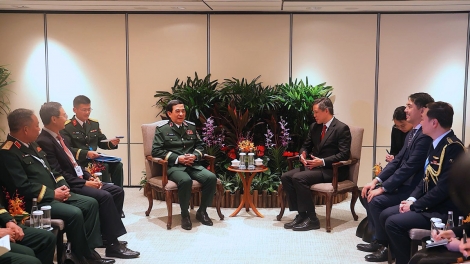(VOVWORLD) -5月31日,出席在新加坡举行的第22届香格里拉对话会期间,越南国防部长潘文江大将与新加坡公共服务统筹部长兼国防部长陈振声举行双边会晤。
