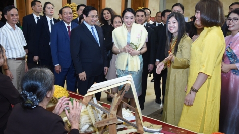 (VOVWORLD) - 在泰国总理佩通坦·钦那瓦访越期间,15日晚,越南政府总理范明政与泰国总理佩通坦一同参观越南手工艺品展览。