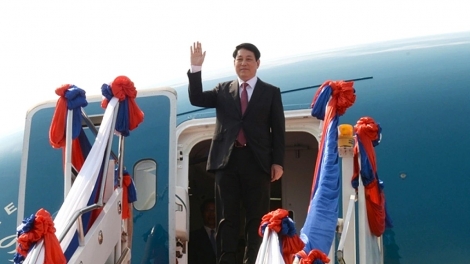 (VOVWORLD) - 4月24日下午3点,越南国家主席梁强率领的越南高级代表团乘飞机抵达首都万象,开始应老挝人民革命党中央总书记、国家主席通伦·西苏里的邀请,于4月24日至25日对老挝进行国事访问。