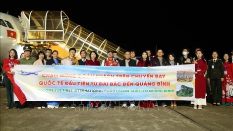 (VOVWORLD) - 3月31日晚,广平省文化体育旅游厅与同亥机场、越捷航空股份公司,迎接首趟从中国台北飞往越南广平省的国际航班旅客。