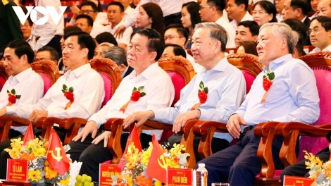 (VOVWORLD) - 3月29日上午在岘港市仙山体育宫,越共中央总书记苏林出席庆祝岘港市市委成立95周年、岘港市解放50周年暨一级劳动奖章颁授仪式。