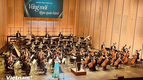 (VOVWORLD) -晚会上,观众和音乐爱好者欣赏了描绘越南人民军生活、战斗和保卫祖国的雄壮激昂歌曲,以及颂扬爱国情怀和民族自豪感的歌曲。