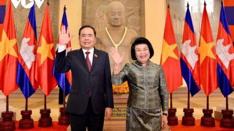 (VOVWORLD) - 柬埔寨国会主席昆索达莉(Khuon Sudary)11月21日下午在首都金边柬埔寨国会大厦主持仪式,欢迎越南国会主席陈青敏同越南党、国会高级代表团正式访问柬埔寨。欢迎仪式后,双方举行会谈。