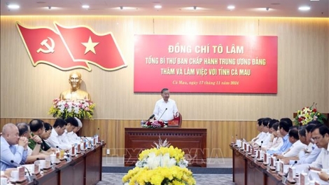 (VOVWORLD) - 11月17日下午在金瓯市,越共中央总书记苏林与金瓯省委常委就越共十三大决议及越共金瓯省第十六次代表大会(2020年至2025年任期)决议实施结果举行工作会议。