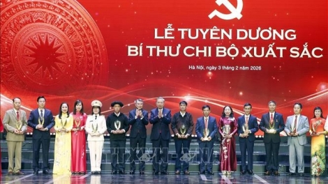 (VOVWORLD) -为纪念越南共产党成立96周年,优秀党支部书记表彰大会暨2025年第十届“金锤镰奖”颁奖仪式于2月3日晚在河内还剑湖剧院举行。越共中央总书记苏林、政府总理范明政、国会主席陈青敏、书记处常务书记陈锦绣等领导人出席活动。