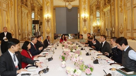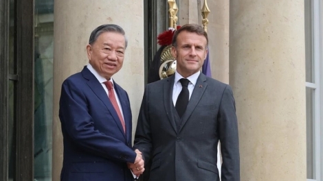 (VOVWORLD) - 应法国总统马克龙邀请,苏林总书记、国家主席于10月6日至7日对法国进行正式访问。当地时间10月7日中午,在巴黎爱丽舍宫举行的欢迎仪式结束后,苏林总书记、国家主席同马克龙总统举行会谈。