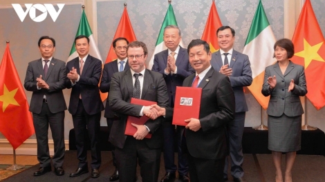 (VOVWORLD) - 对爱尔兰进行国事访问期间,当地时间10月3日在爱尔兰首都都柏林,越共中央总书记、国家主席苏林在与爱尔兰企业会面后出席了越南与爱尔兰合作文件互换仪式。