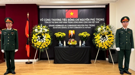 (VOVWORLD) - 7月26日下午13时,阮富仲总书记追悼会同时在河内市陈圣宗街5号国家殡仪馆、胡志明市统一大会堂和阮富仲总书记家乡河内市东英县东会乡赖沱村文化馆举行。