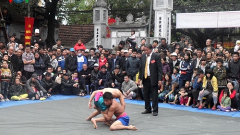 (VOVworld)- 数百年来,每逢春节,河内市梅洞村,即现在的河内市南部黄梅郡梅洞坊都会于大年初四至初七在村亭举行摔跤节。阵阵鼓声让赶着参加节日的人们兴奋不已,人人都希望早点儿来,以及时参加和欣赏河内这座著名村庄的特色文化活动。