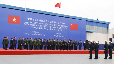 (VOVWORLD) - 在越中第十次边境国防友好交流活动框架内,越南国防部长潘文江大将与中国国防部长董军上将3月19日上午在中国防城港码头出席越南人民海军与中国人民解放军海军第四十次北部湾海域联合巡逻及两国海军海上联合训练起航仪式。