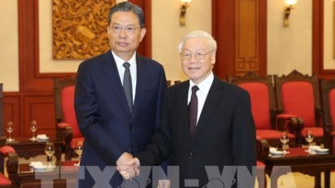 (VOVWORLD) - 9月27日下午,越共中央总书记阮富仲在党中央总部会见了正对越南进行工作访问的中共中央政治局常委、中央纪律检查委员会书记赵乐际。