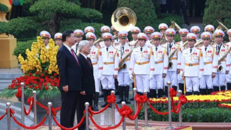 (VOVWORLD) -越共中央总书记阮富仲和国家主席陈大光11月12日在河内举行隆重招待会,欢迎中国国家主席习近平对越南进行国事访问。
