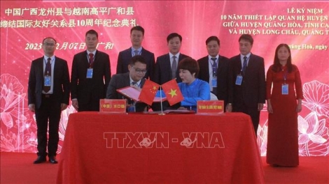 (VOVWORLD) - 越南高平省广和县与中国广西龙州县缔结友好县10周年庆祝活动暨广和县驮隆镇与龙州县水口镇缔结友好镇协议签字仪式12月7日在高平省广和县驮隆友谊中心举行。