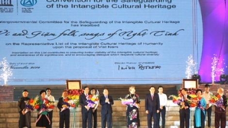 (VOVworld)- 义静威任民歌(Ví, Giặm)获颁“人类非物质文化遗产代表作”证书仪式1月31日晚在义安省荣市举行。