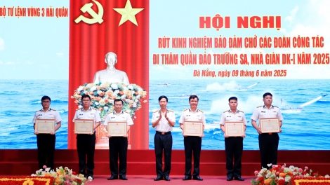 (VOVWORLD) - 越南海军第三区6月9日在岘港市举行会议,总结参观考察长沙岛县和DK1海上高脚屋的工作代表团接送工作并汲取经验。