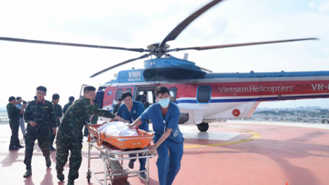 (VOVWORLD) - 7月31日下午,18兵团的VN-8619号直升机降落在175军医院创伤骨科大楼停机坪,把在庆和省长沙岛县两名重症患者安全送回陆地。