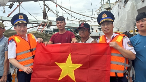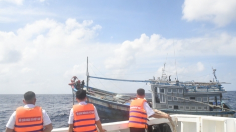 (VOVWORLD) - 越南海军第四区471号舰2月20日上午成功拖曳发动机发生故障的KH98246TS号渔船,从距长沙群岛安邦岛9海里的海域,回到西石岛进行修复。