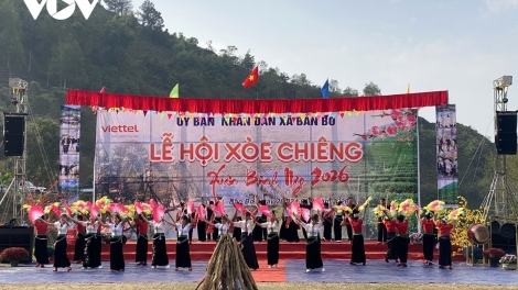 (VOVWORLD) - 在老街省板波乡纳姜社区旅游村的空间里,锣鼓声回荡,与热闹的圆圈舞相融,新年锣钲圆圈舞节的欢乐响彻山林。这里泰族同胞的锣钲圆圈舞节不仅保存着民族文化的灵魂,更成为凝聚社区、推广旅游潜力和地方特产的约定之地。