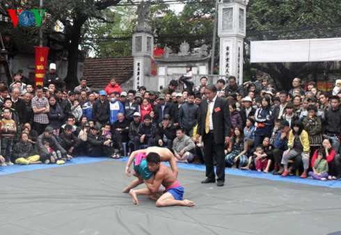 (VOVworld)- 数百年来,每逢春节,河内市梅洞村,即现在的河内市南部黄梅郡梅洞坊都会于大年初四至初七在村亭举行摔跤节。阵阵鼓声让赶着参加节日的人们兴奋不已,人人都希望早点儿来,以及时参加和欣赏河内这座著名村庄的特色文化活动。