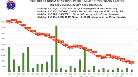 (VOVWORLD) -据越南卫生部的消息,自4月9日16时至10日16时,越南全国报告新增新冠肺炎确诊病例28307例,比昨日下降5831例。全国新增康复病例34991例,死亡病例19例。