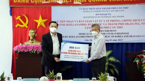 (VOVWORLD) -芹苴市外事局1月4日以视频方式举行韩国全罗南道(Jeollanamdo)和日本冈山市(Okayama)援助越南芹苴市的防疫医疗物资交接仪式。