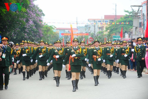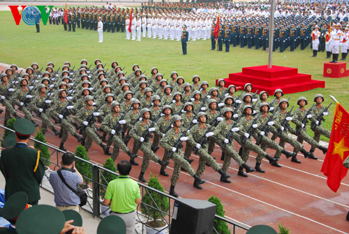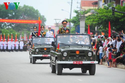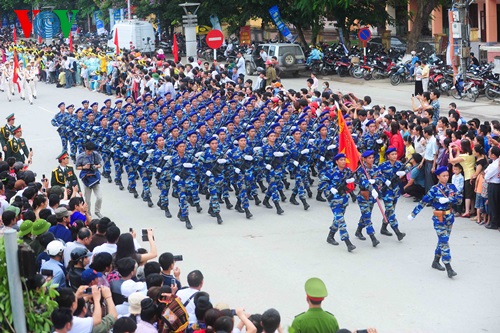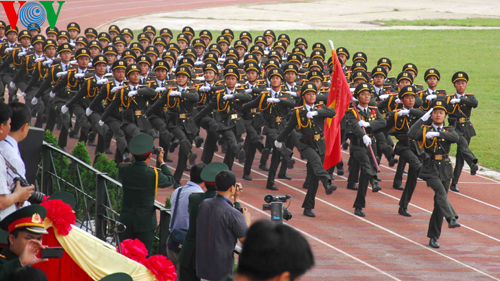 紧随其后的是党旗、国旗、胡主席像彩车,奠边府大捷标识彩车方阵。再之后是越南人民军和人民公安力量等方阵。