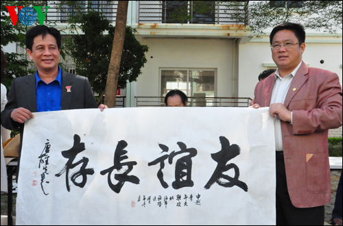 越南胡志明共青团中央常务委员会委员、北海分团团长胡文喜接过中方代表赠送的书法作品“友谊长存”
