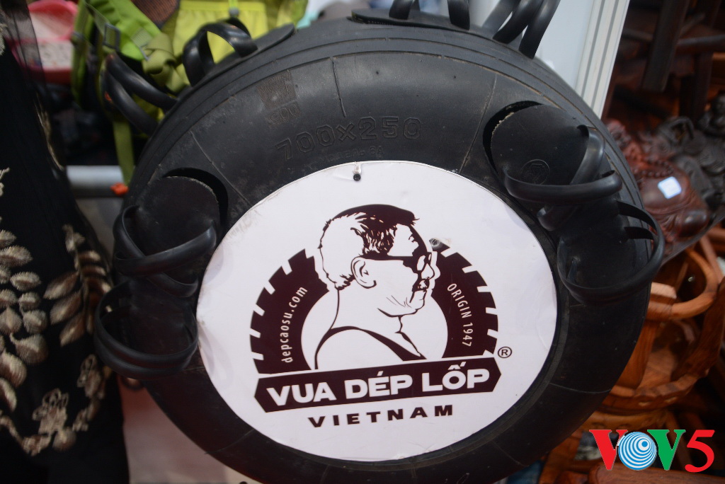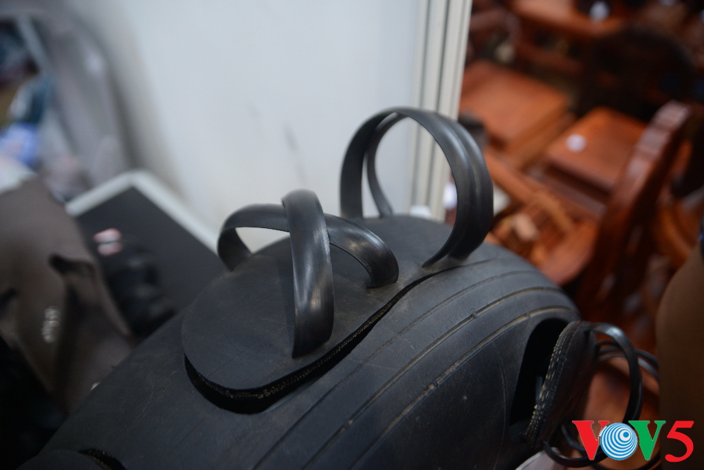 介绍用轮胎制作拖鞋产品的展位让观众十分好奇
