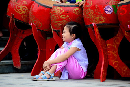 小朋友坐在大鼓旁开心地观看再现光忠皇帝胜利的节目