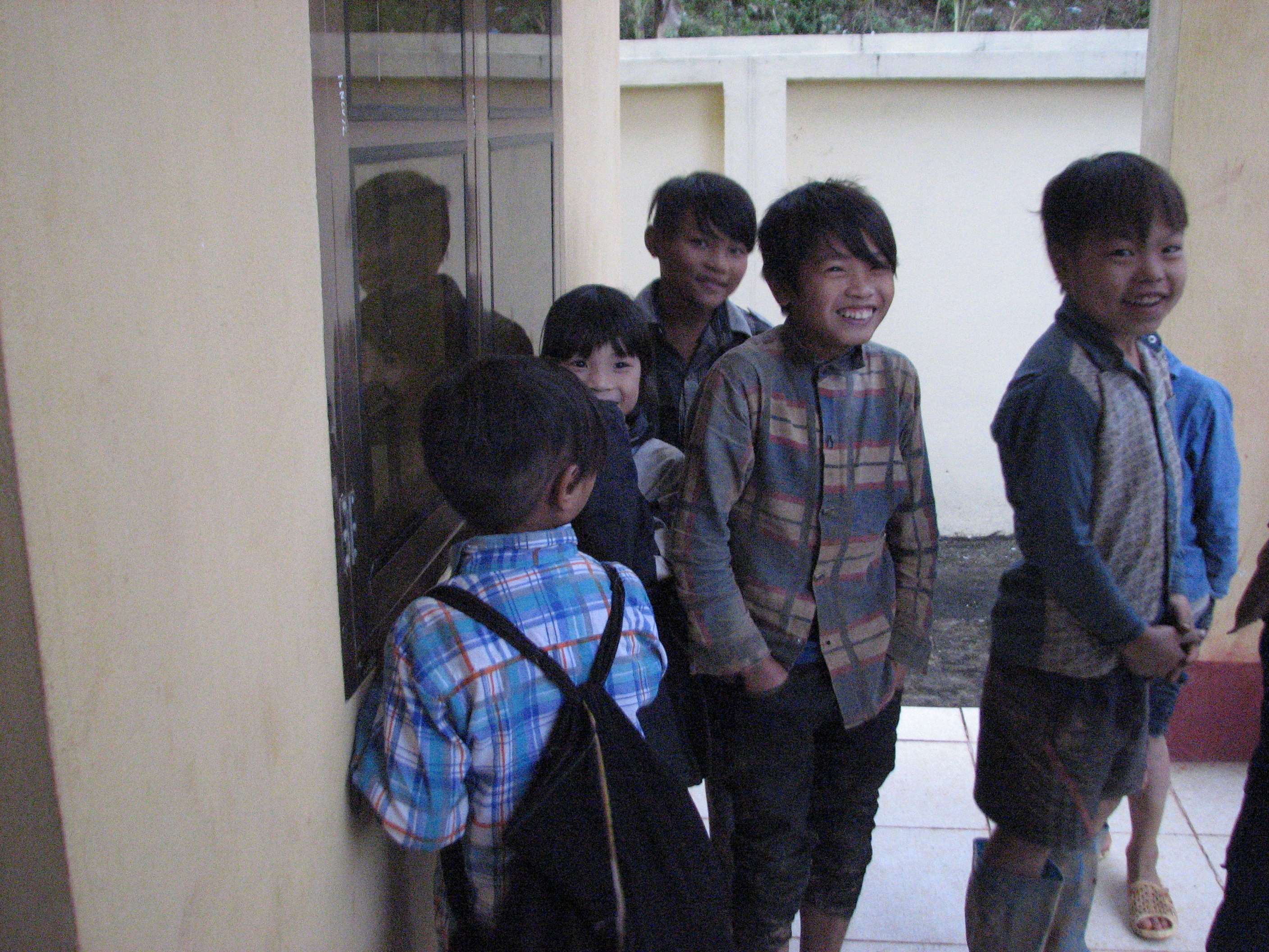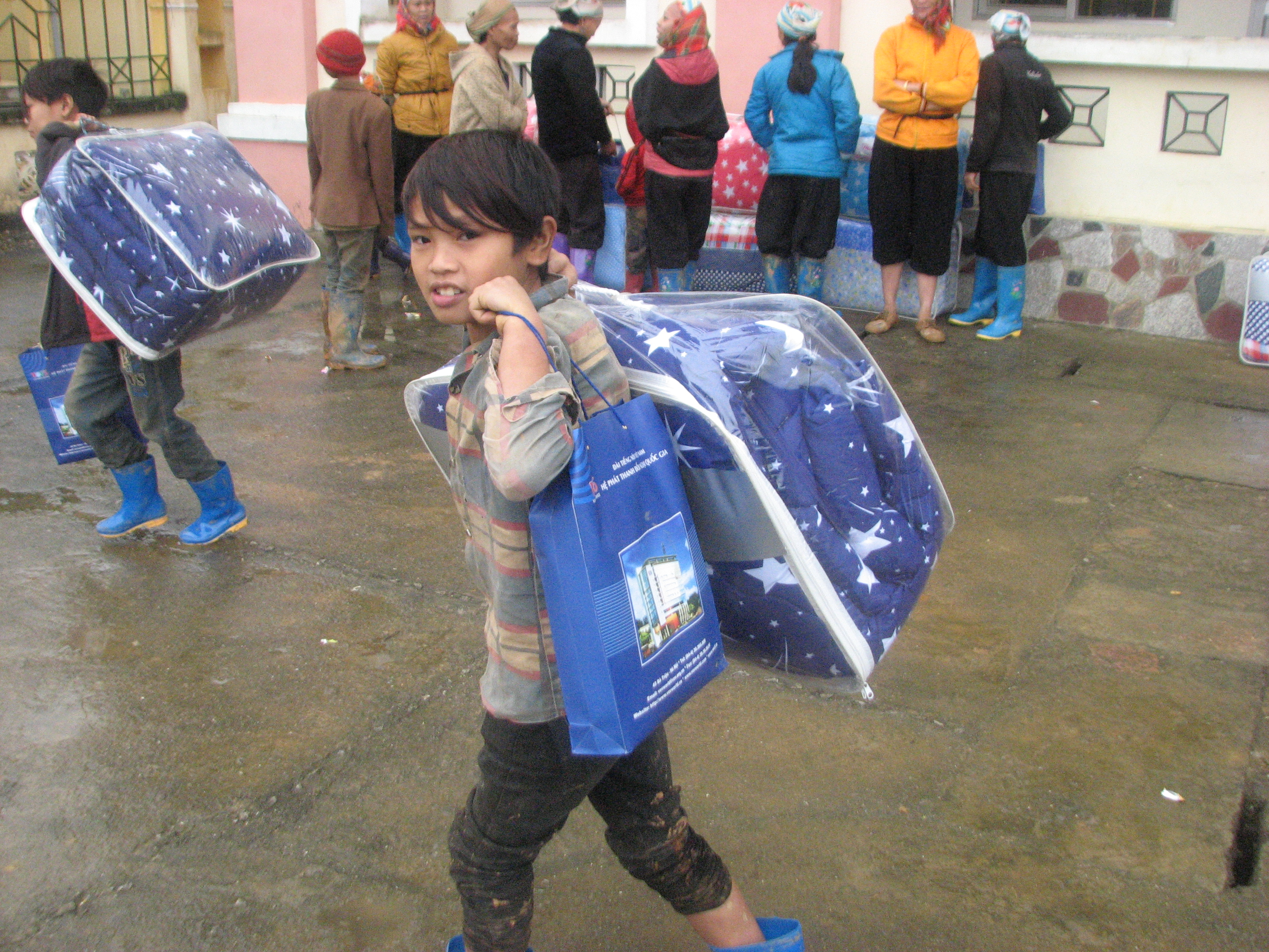 第二天上午,当地小朋友穿着VOV5代表团前晚送的新短胶靴来帮父母领慰问品