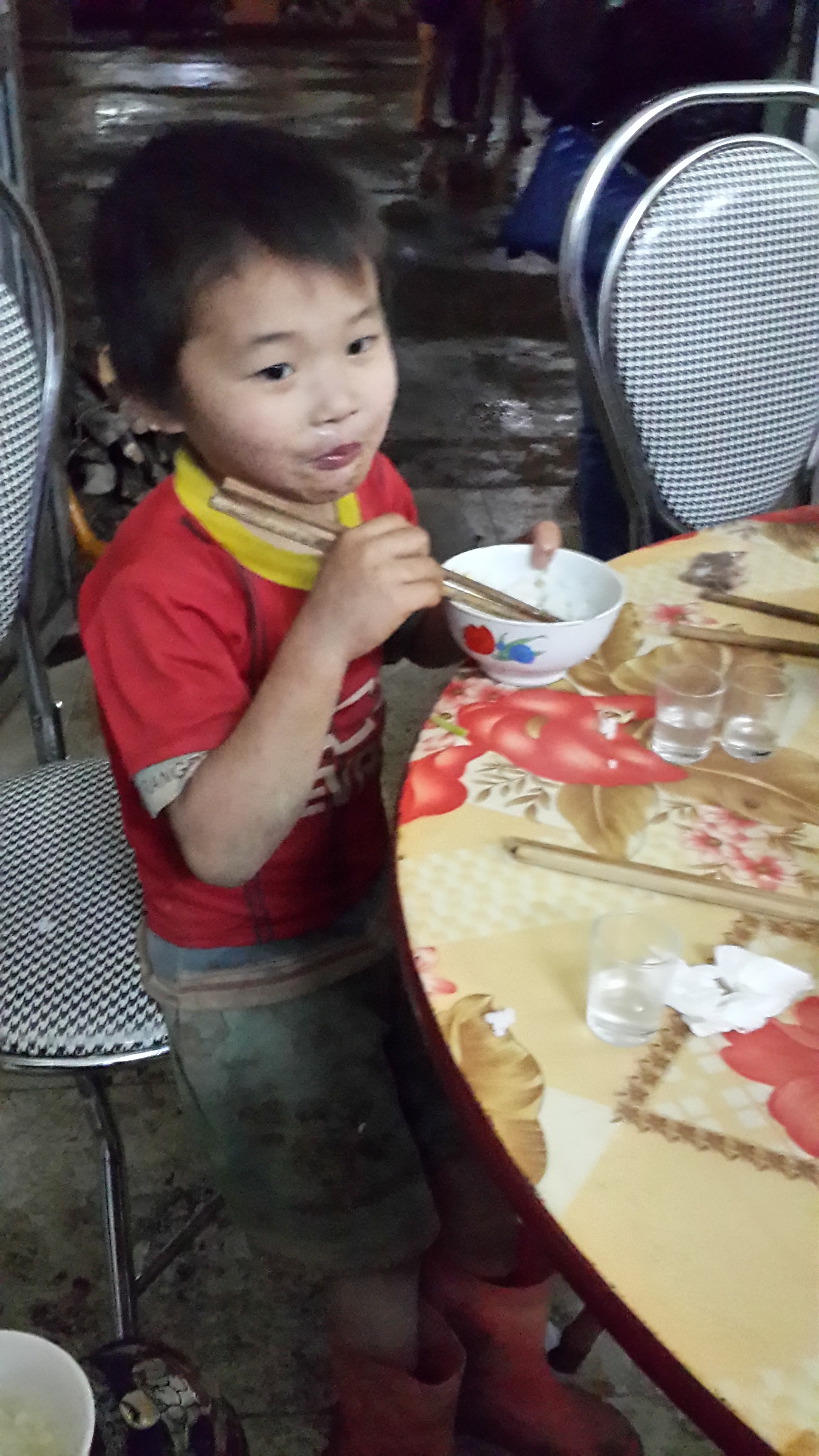 表演当天,这名七岁瑶族男孩下午3、4点下课后,立即赶往乡中心等着领东西和观看表演。随后,他与早早就来到这里的乡民和其他小朋友被乡政府工作人员和边防部队带到食堂吃晚餐。当时,外面气温约10度并下着雨
