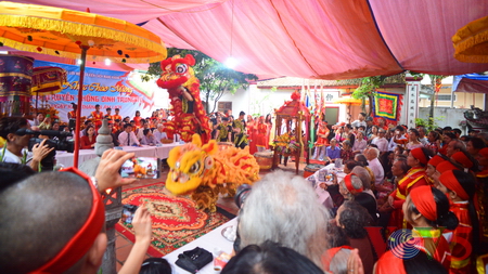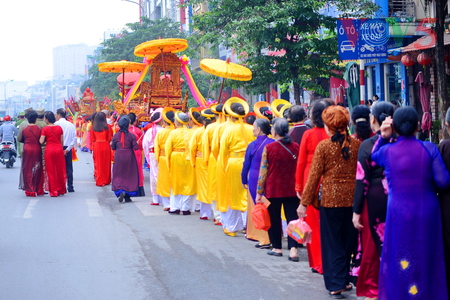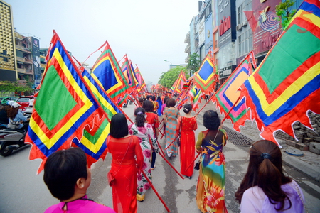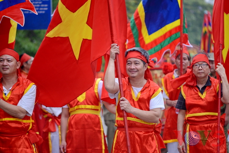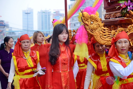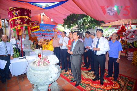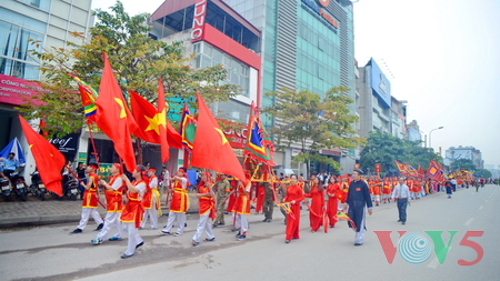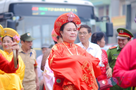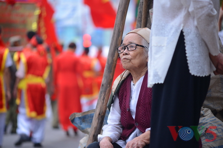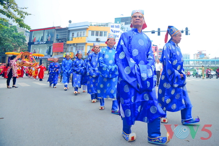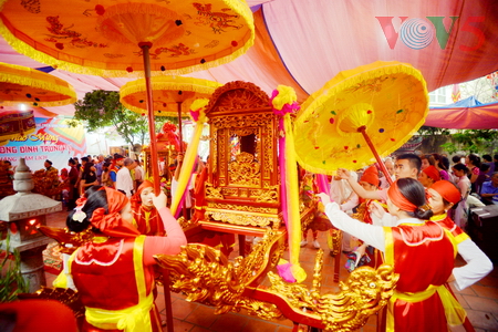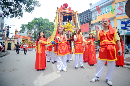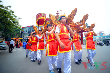 (VOVworld) - 农历四月十六,星期四上午八点,数百人集中在金莲亭,为“高山大王”迎轿仪式做准备。这是每年举办的大型庙会之一,旨在铭记高山神的功德。他击败逐水神,扶王复国,同时也是镇守升龙京城南部的大神。