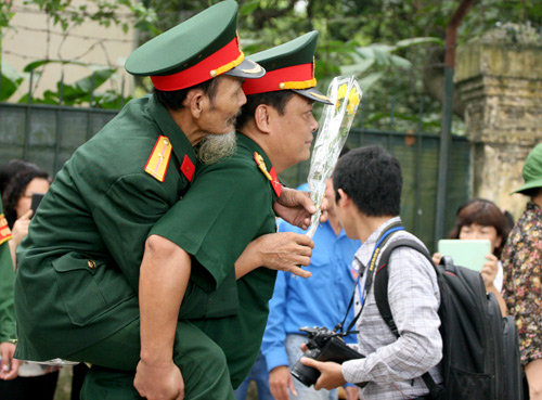 双脚走不动的老兵杨文双让警卫背着进去献花(图片来源Vnexpress)